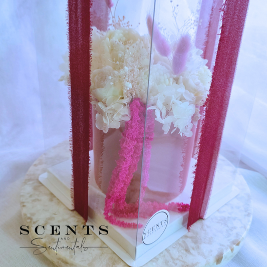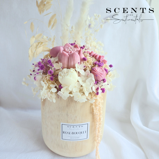 Everlasting Bouquets are made from Scented Soy Wax in Flower shapes along with Preserved Florals in a choice of Rigid Cardboard boxes, Ceramic, Timber & Cement Vases or wrapped neatly with Floral Paper.